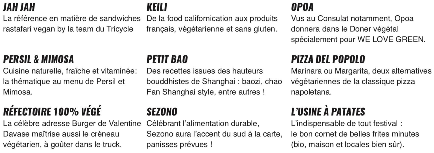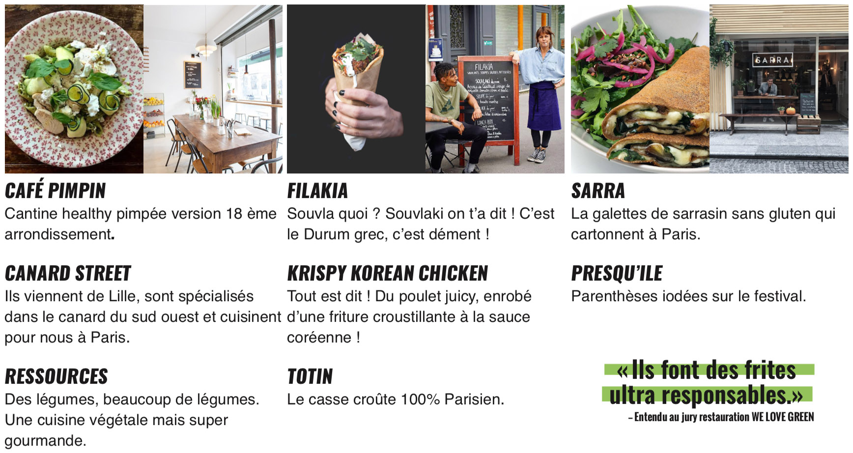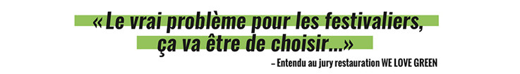 Restaurateurs, producteurs, street food… : ils vous régalent depuis les débuts de WE LOVE GREEN. Il n’y a pas de raison que ça change. Cœur avec les doigts.